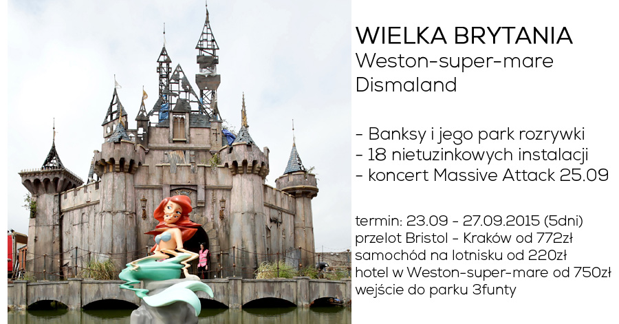Na południowym zachodzie Anglii w miasteczku Weston-super-mare powstał park rozrywki stworzony przez jednego z najbardziej tajemniczych artystów współczesnego świata. Banksy, bo o nim mowa stworzył wraz z innymi artystami 18 instalacji, które mają za zadanie wywołać u widzów konsternację. Przykładami takich prac jest Karoca Kopciuszka po dachowaniu lub podupadły zamek Śpiącej Królewny.